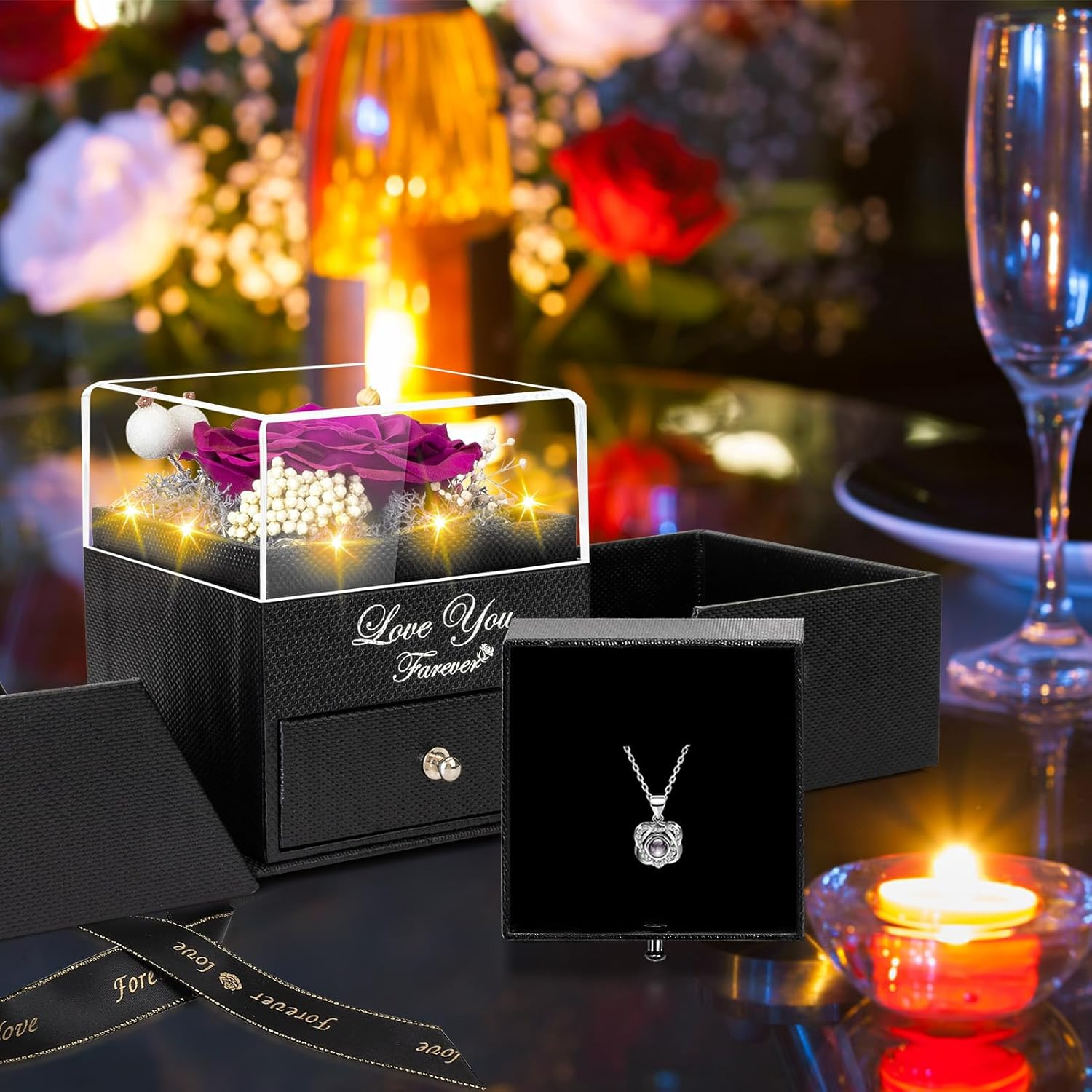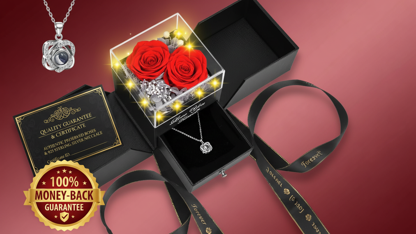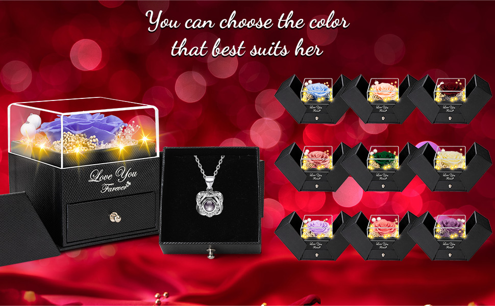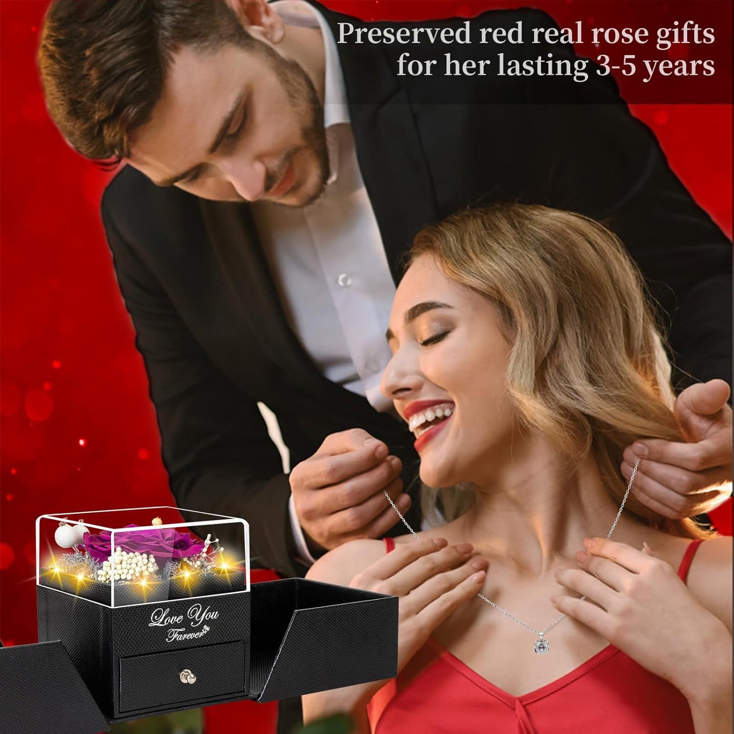 The preserved rose keeps its beauty for years, while the hidden necklace underneath creates a second “wow” when she discovers it.