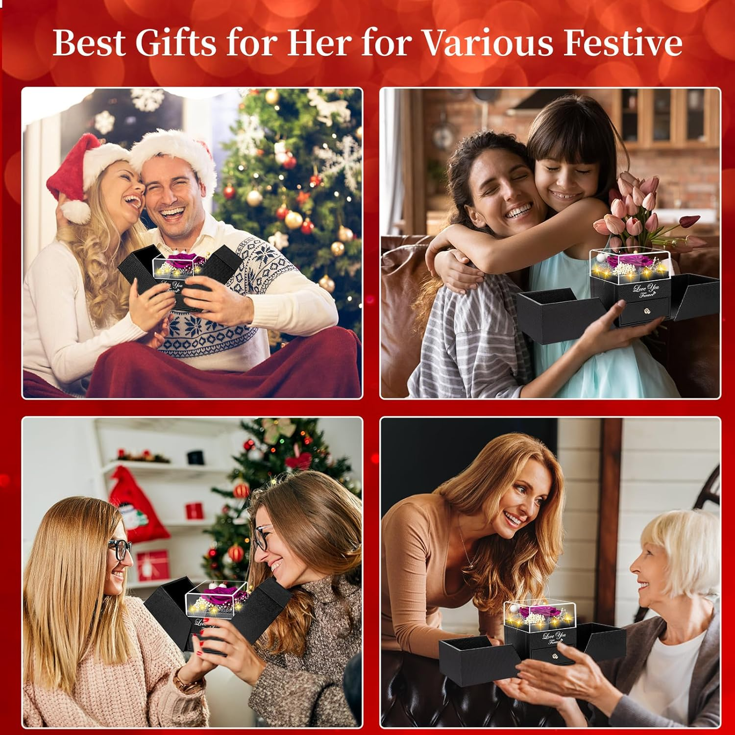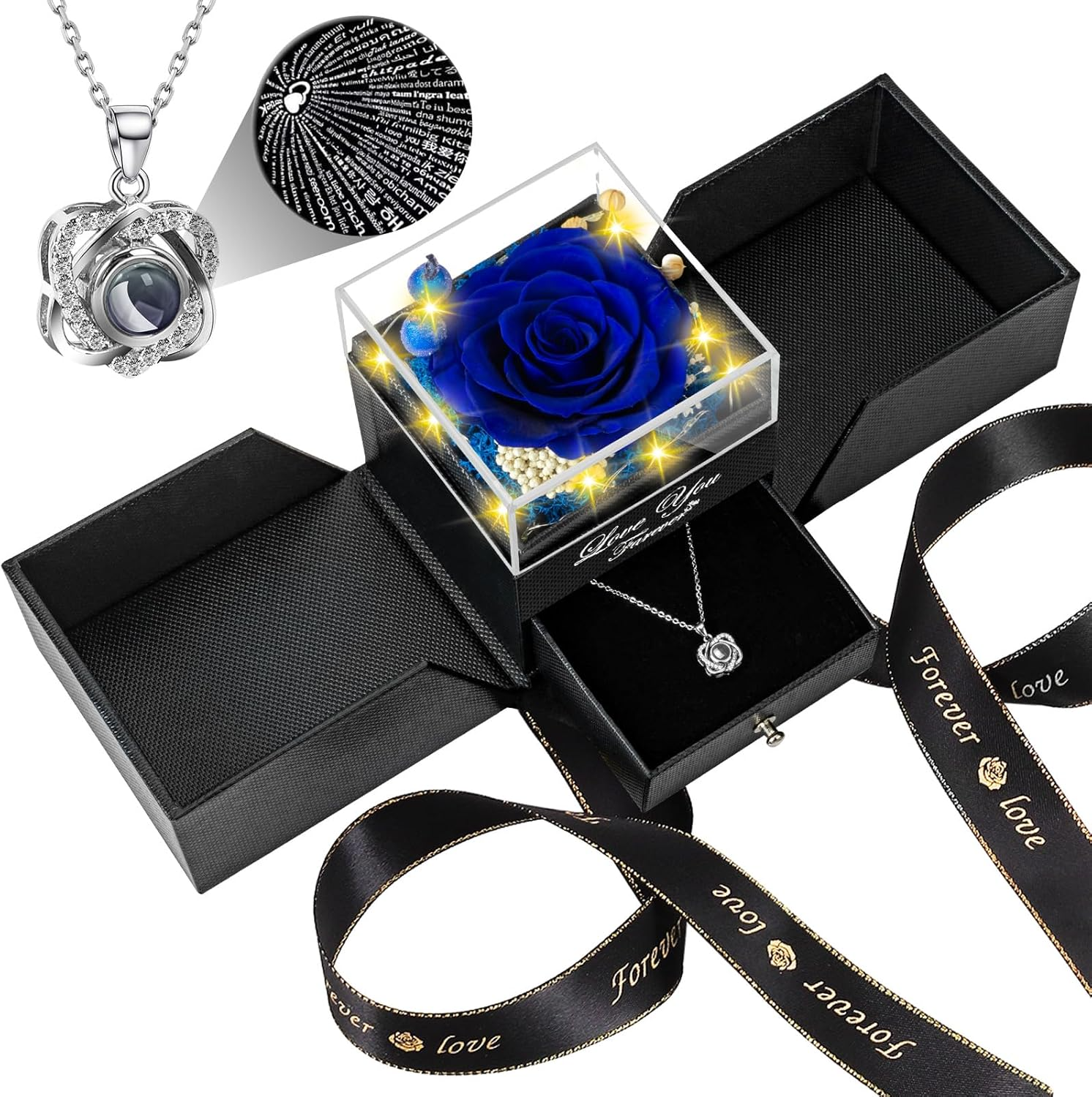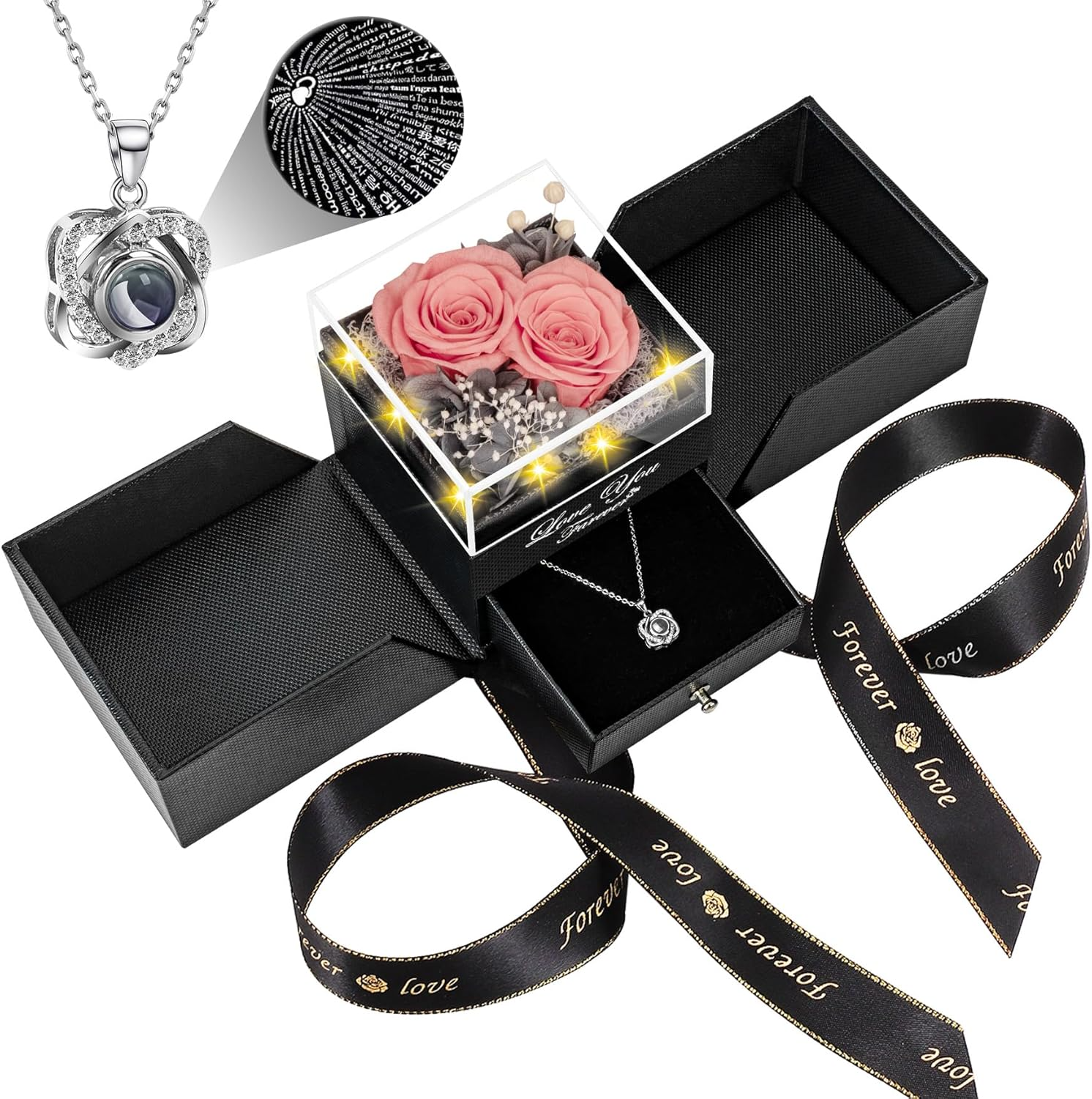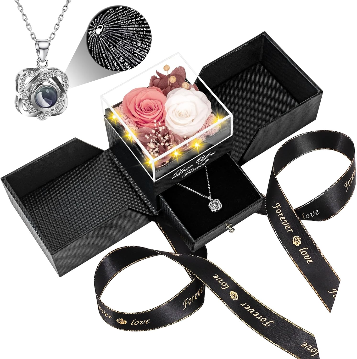 The preserved rose keeps its beauty for years, while the hidden necklace underneath creates a second “wow” when she discovers it.