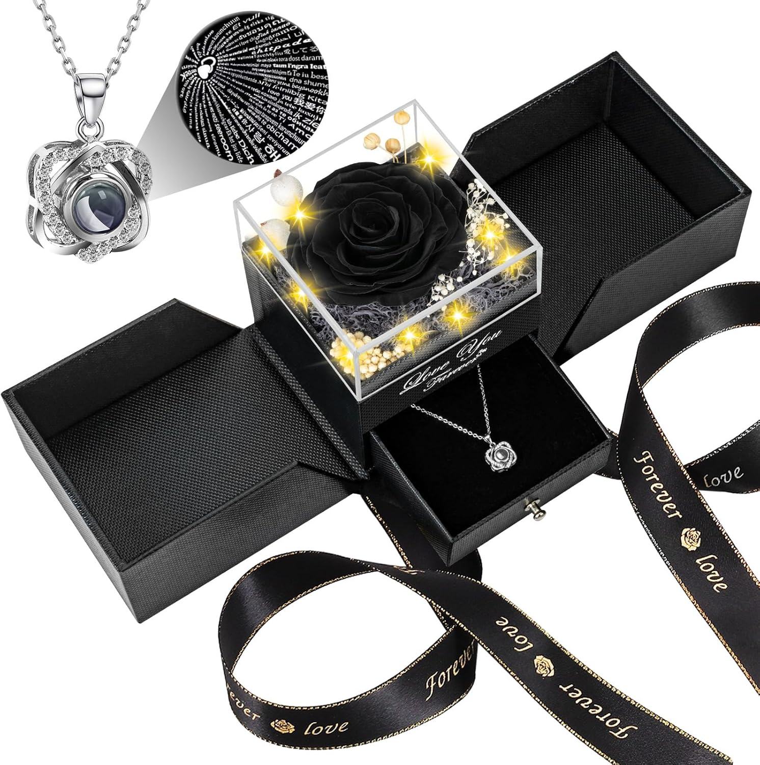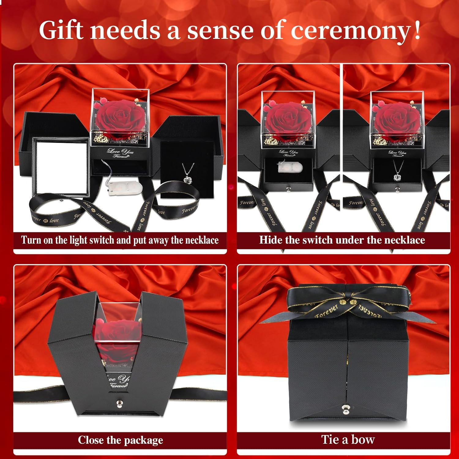 - All‑in‑one set: rose, necklace, gift box, bag and card — ready to give, no extra wrapping needed.
